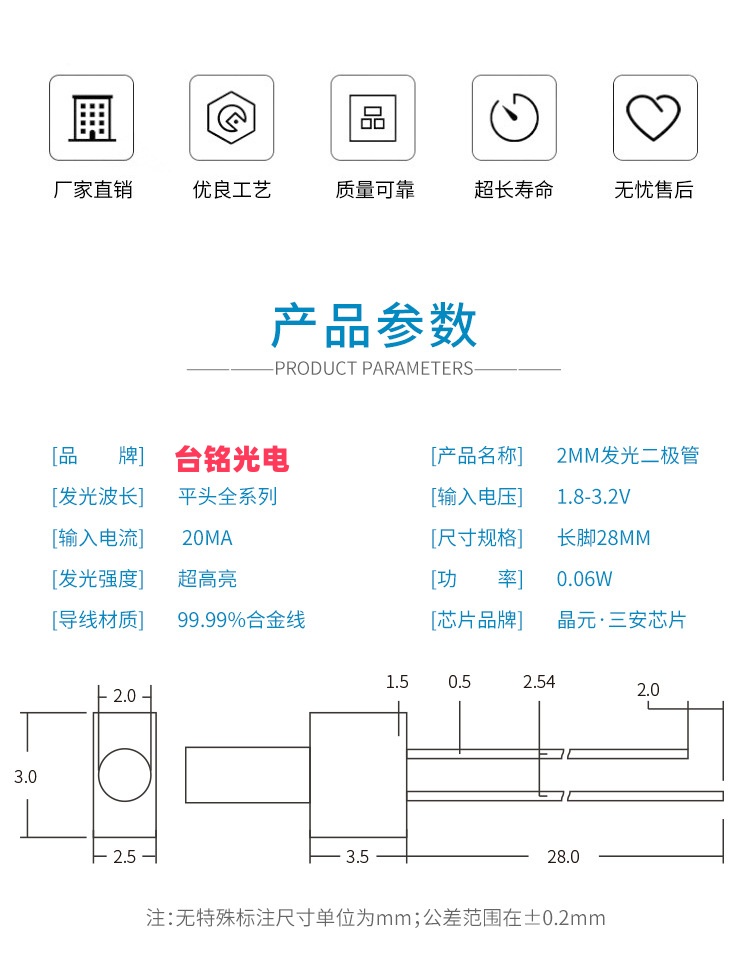 尺寸:直径2mm(F2规格,部分厂家标注为φ2mm)