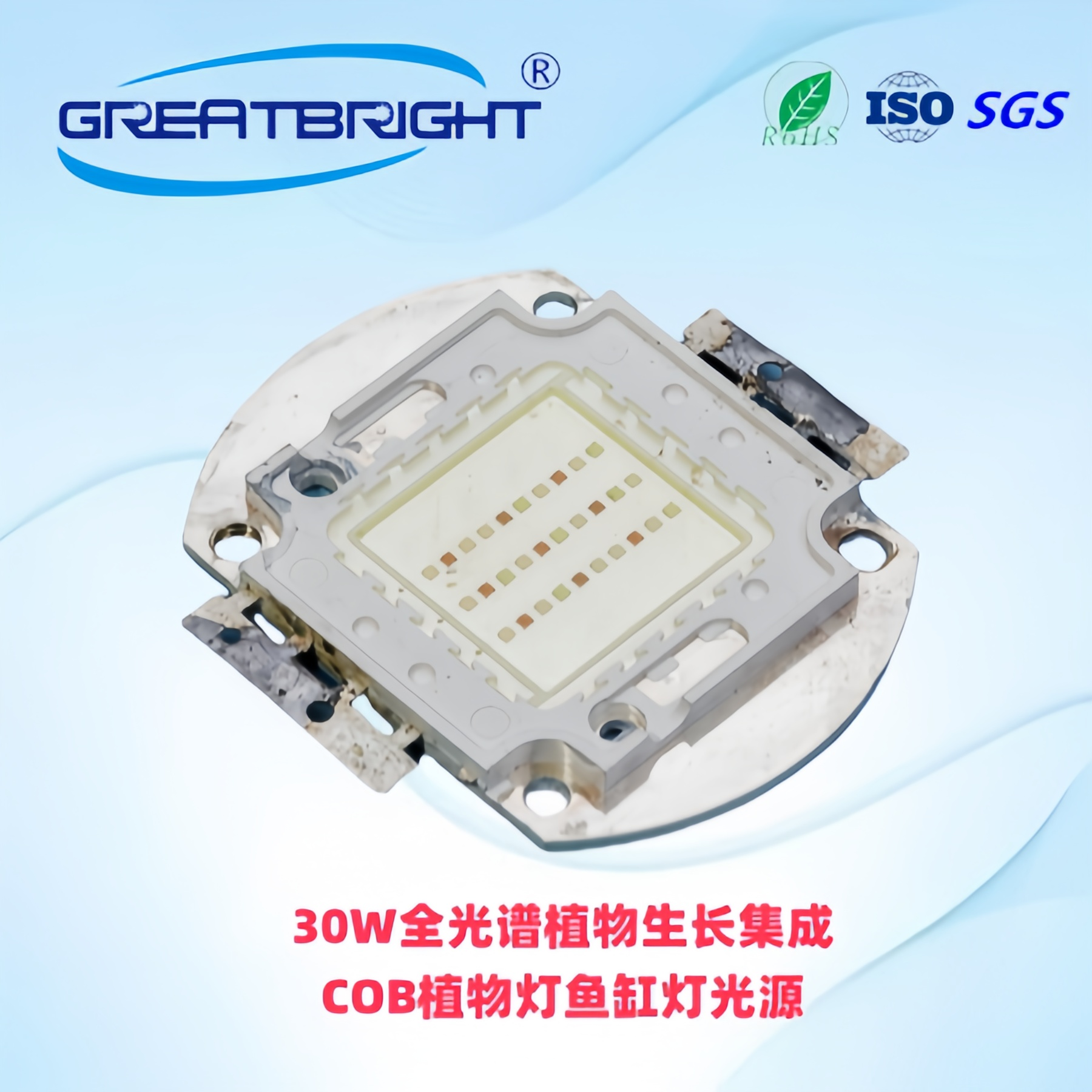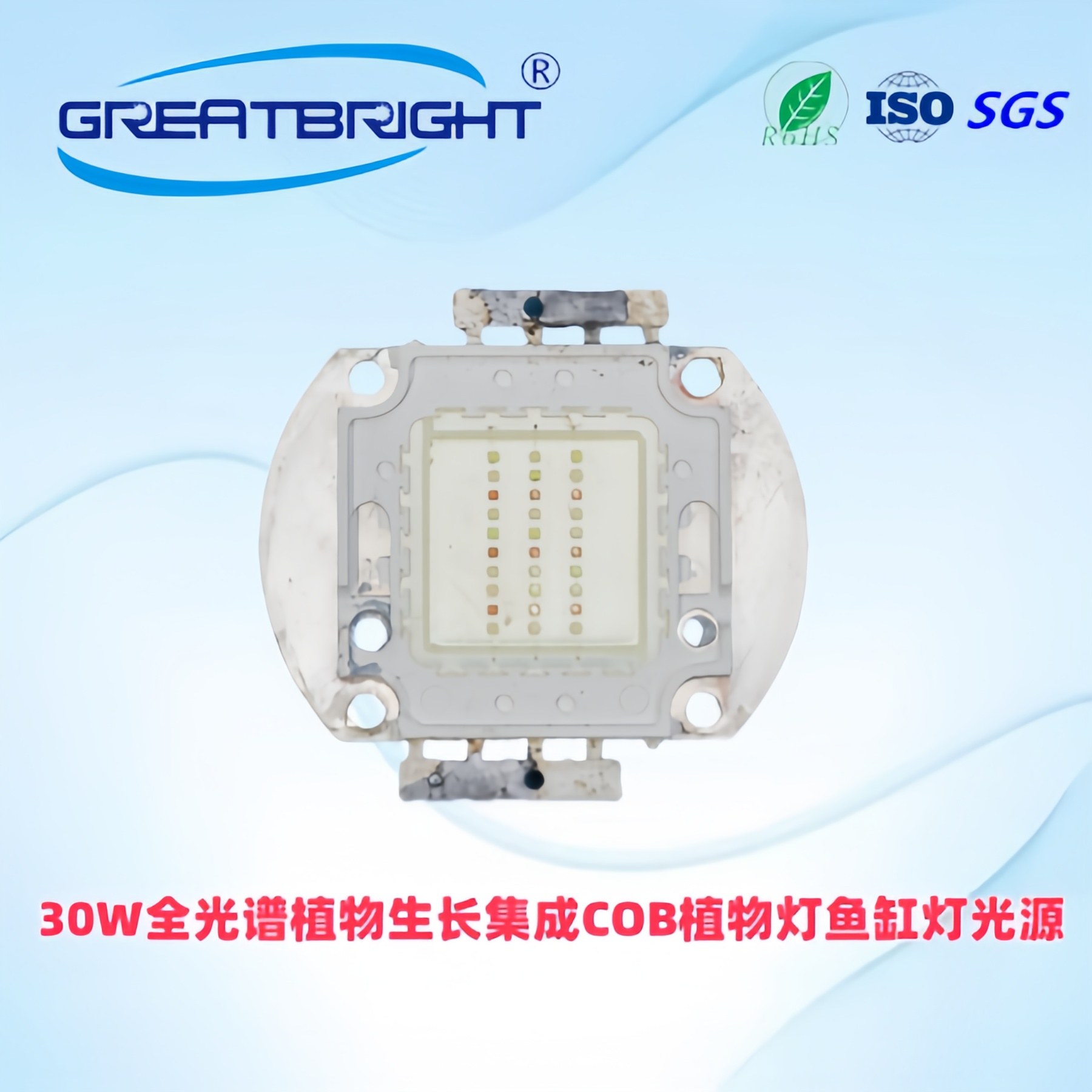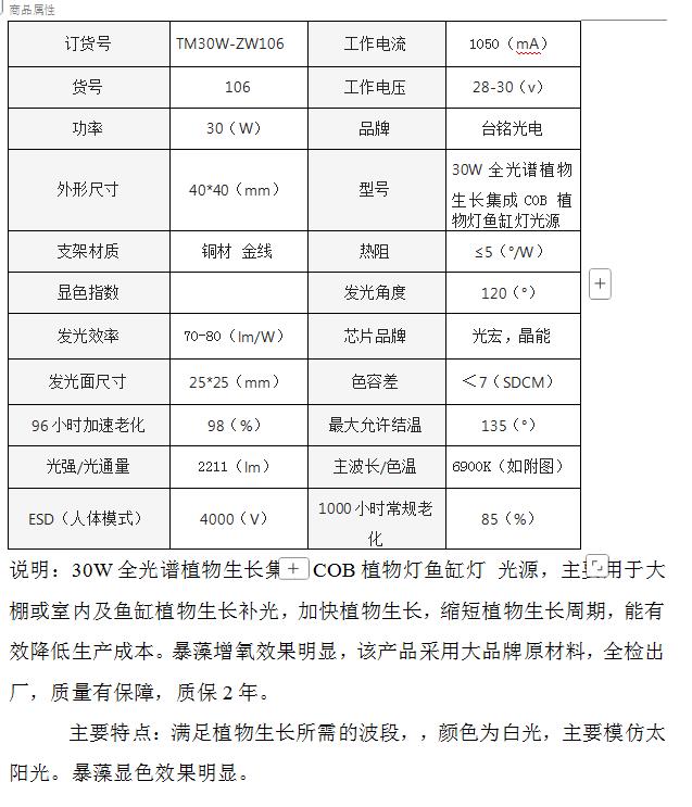说明:30W全光谱植物生长集成COB植物灯鱼缸灯 光源,主要用于大棚或室内及鱼缸植物生长补光,