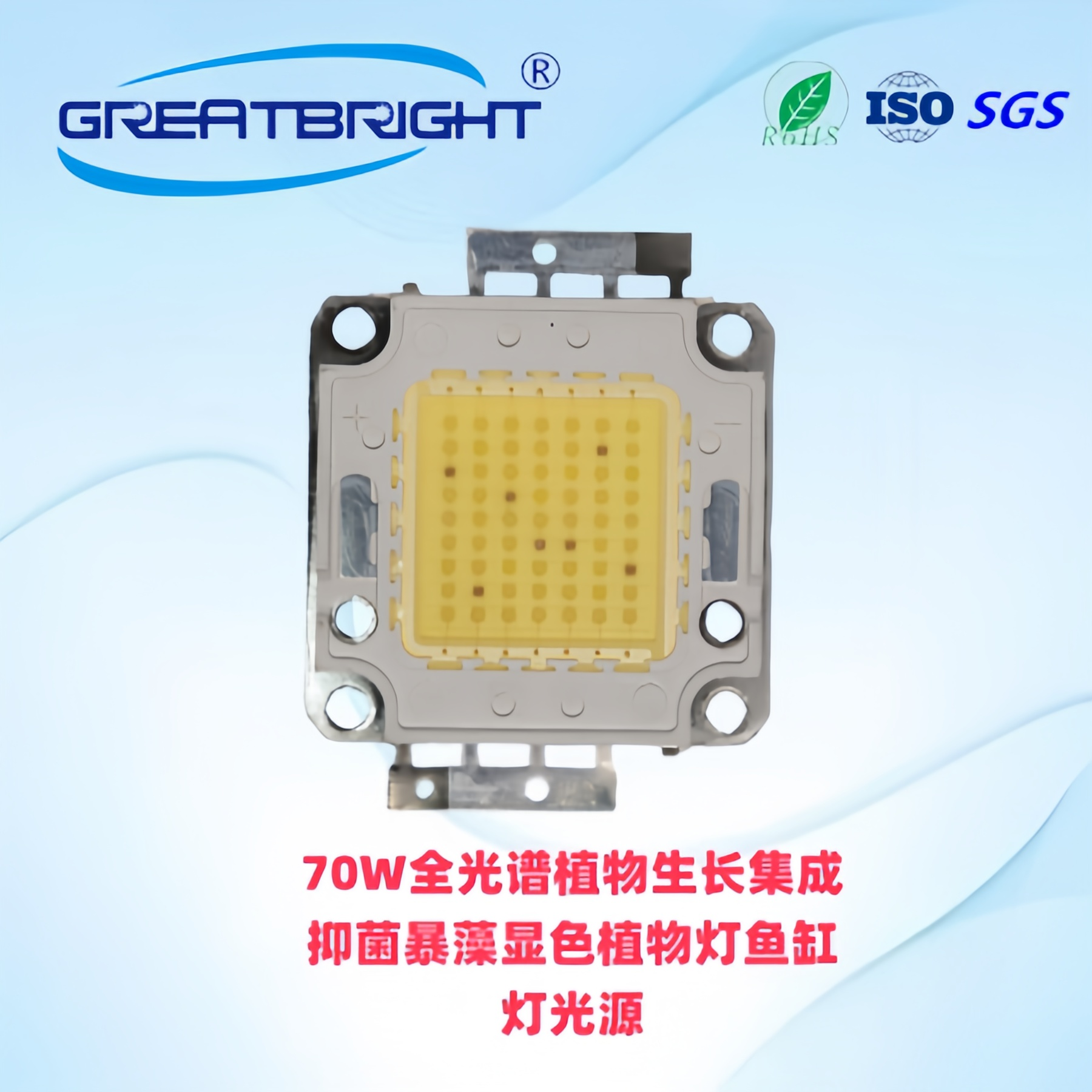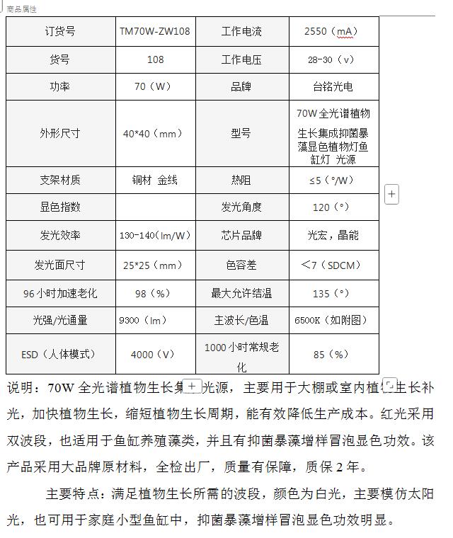 说明:70W全光谱植物生长集成光源,主要用于大棚或室内植物生长补光,加快植物生长,