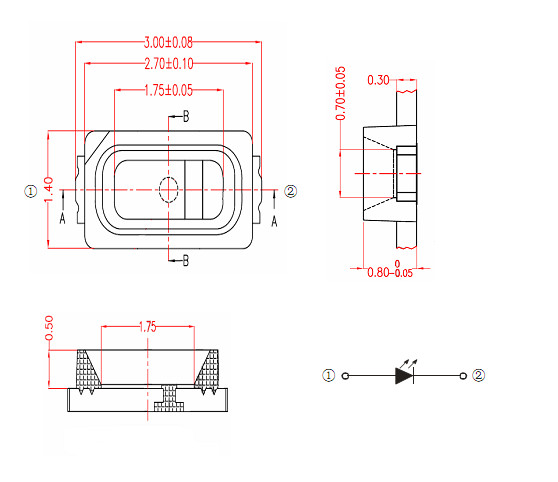 | TM-S3014SR-E (深红色) | Scarlet | AlGaInP | 120° | 1.8 | 2.4 | 400 | 1000 | 650 | 660 | 30MA |