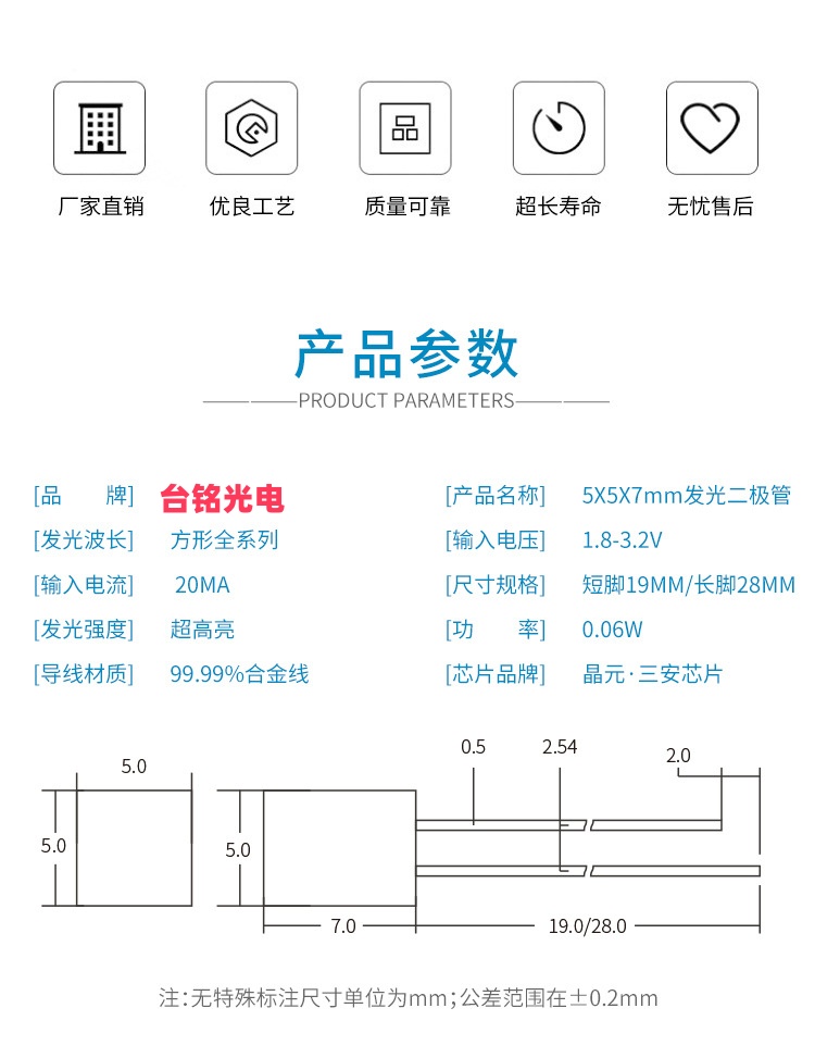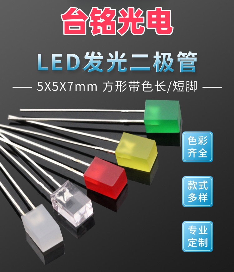 5×5×7mm 方形直插LED灯珠(长脚或短脚,红、蓝、黄、绿高亮)是一种 中功率DIP LED